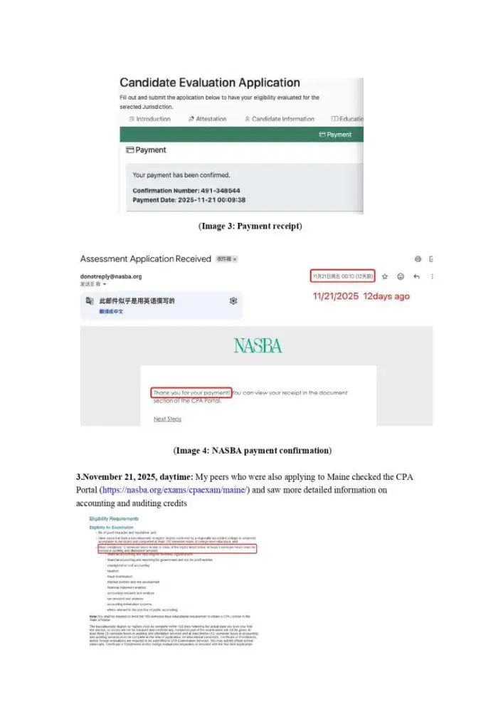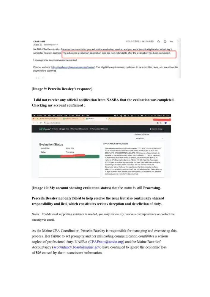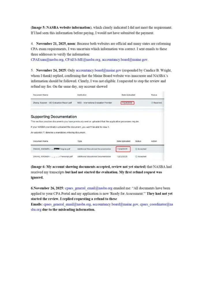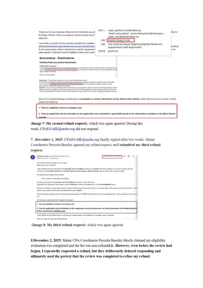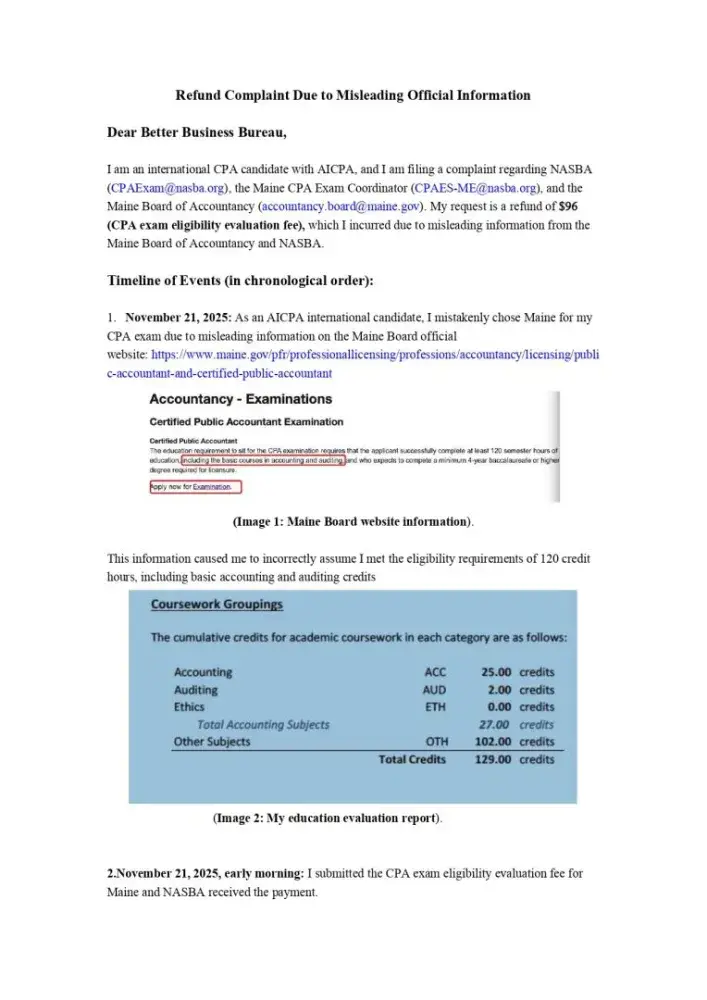 I am an international CPA candidate who applied for exam eligibility in Maine. Misleading information on the Maine Board and NASBA websites caused me to apply under incorrect assumptions. On November 21, 2025, I requested via email to NASBA and Maine CPA coordinator Perceita Beasley to stop the review and refund my $96 fee. Before they even started...