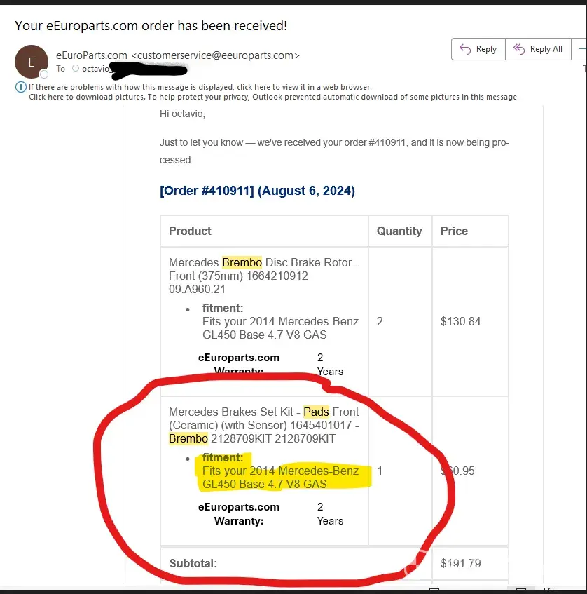 the Website is misleading. Product showed compatible with my vehicle. Dean in customer service will not refund or exchange the pads, he redirected the conversation and said it was my fault for not double checking. please see the attached invoice, it clearly states the brake pads are compatible with my 2014 GL450.