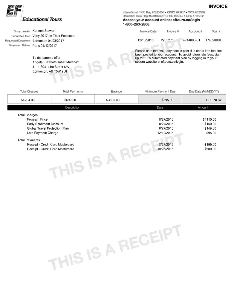 My daughter is with the army cadets and they had booked a trip with EF Tours for 2017. They required a $199.00 deposit and then $500.00 every few months or so. I had paid the $500.00 first payment so my total payments so far was $699.00. I then found out that my parents who are 77 an 78 are very sick so we needed to move closer to them. I am in Edmonton and they are in Toronto. I am uplifting my family's whole life to move closer to my parents so I needed to cancel the trip with EF Tours for my daughter from her cadet corp.
