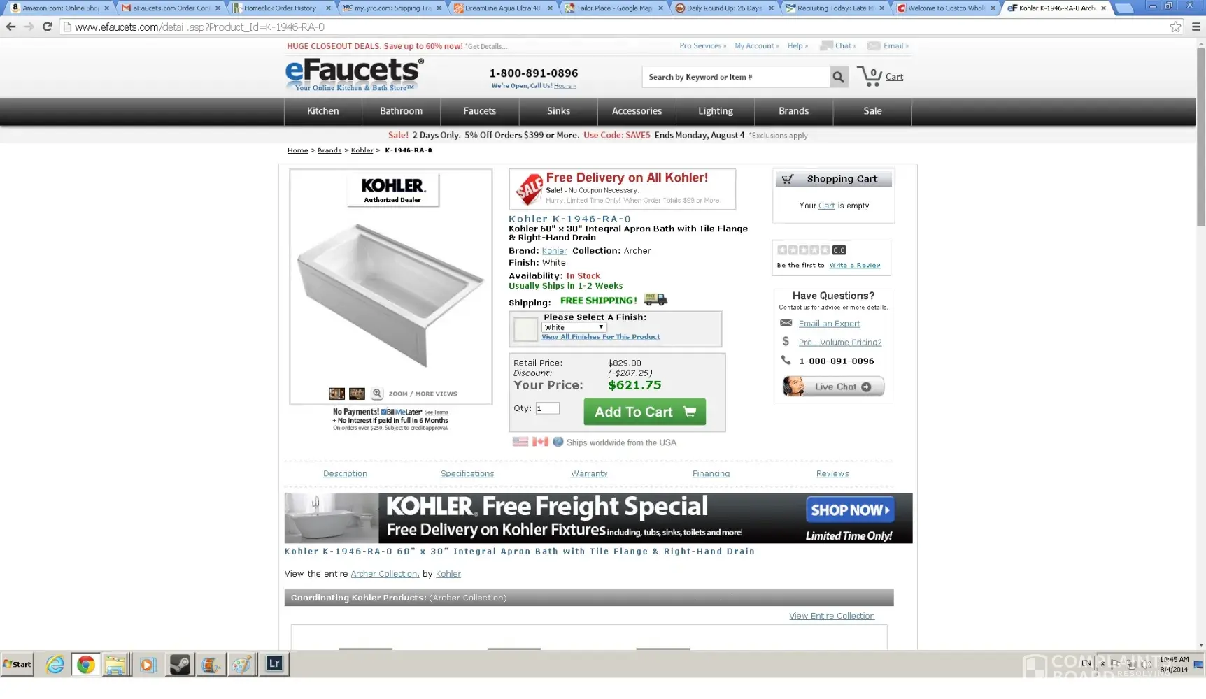 Total scammers! They do business with different web addresses so becareful! They dangle the carrot to get your business by saying it's in stock. Well, the tub I ordered apparently was not. It's been 2 months and I still have yet to receive anything. I get an e-mail saying that Kohler cancelled the order and it would be another 2 to 3 weeks! 3 months for an order that should be in stock? WTF! So, I call trying to cancel the order (hey if Kohler cancelled my order, I should be able to right?) They said they could not because it was a special order and it was already headed to the warehouse. WTF it was advertised as IN STOCK! They even threatened me with a 35% restocking fee if I refused shipment. Yet all this time they were pretty quick to charge my credit card the same day I placed the order. Shady shady.