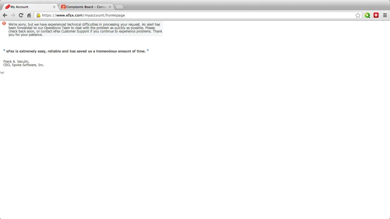 I have been locked out of my account for a month now, unable to read my faxes because my account data has apparently become corrupted on eFax's servers. Because I have a free account, their phone and chat agents absolutely refuse to help me, claiming that they cannot access free accounts. Yet a phone support agent at least took a moment to try, and confirmed that he got the same error when trying to logon to my account from his own computer. Of course, I already knew he would; as I had tried on two Macs, a PC, an Android, and four different browsers before calling.