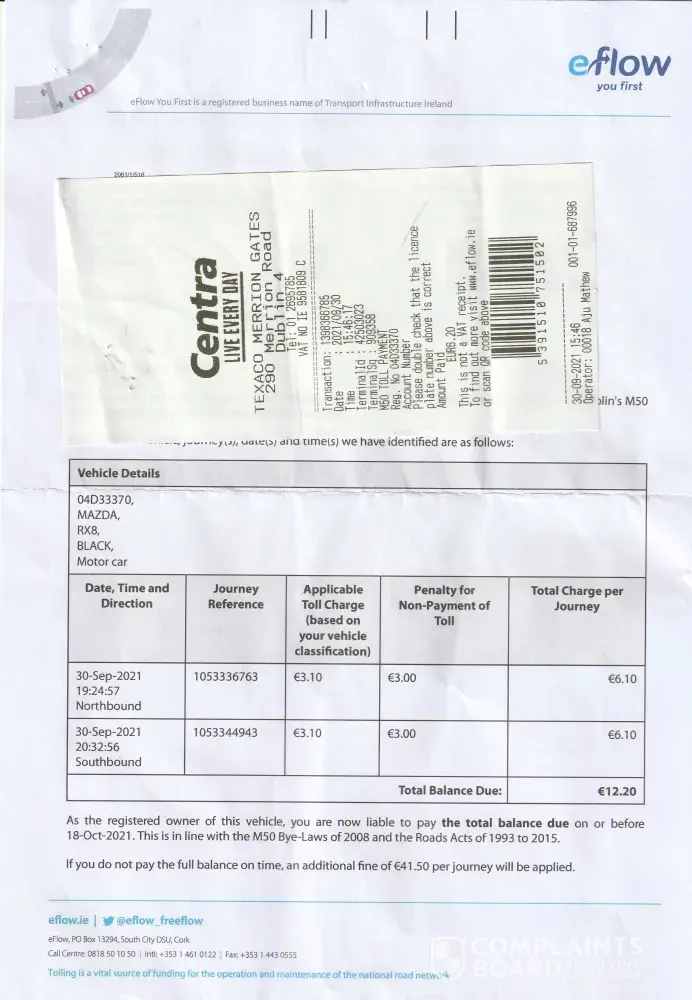 I used the m50 on 11SEP2021, 9.34am and 2.58pm. I paid for tolls on 24SEP @10.26am, for which I have a receipt (which I emailed to EFlow). Paid for before the 8pm next day cut-off.