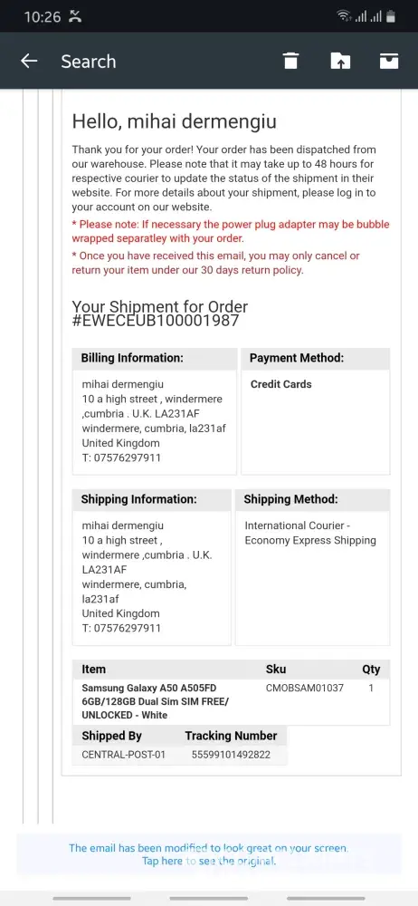 Hello .my name is Mihai Dermengiu.[protected]@yahoo.com. from cumbria .windermere.la231af.U.K. ive bought a samsung galaxy a 50 from globalcentral eu .on May 23rd 2019 and still havent arrive.ive send some e mails to the company, but every time they said, , we sorry, we havent heard from our logistic company or something like that .ive paid 249.99 euros .i would like e refund if is possible becouse ive bought from globalcentral uk .another one and this one came .thank you