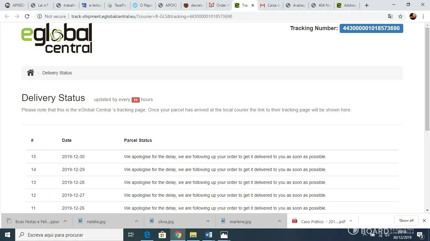 It appears my package is lost by the delivery company. I had taken insurance and despite that, eGlobal Central BE is not answering my email for resolution. This is now over 10 days that no answer while their FAQ says that claims should be escalated within 10 days from the date of order.