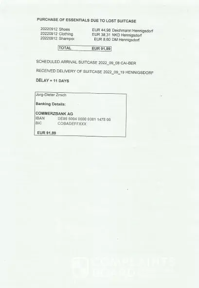 I attached the flight ticket, the regsitration on lost suitcase in BER, the evidence on delayed delivery of lost suitcase and the expense slips for essential purchases with banking details for payment.