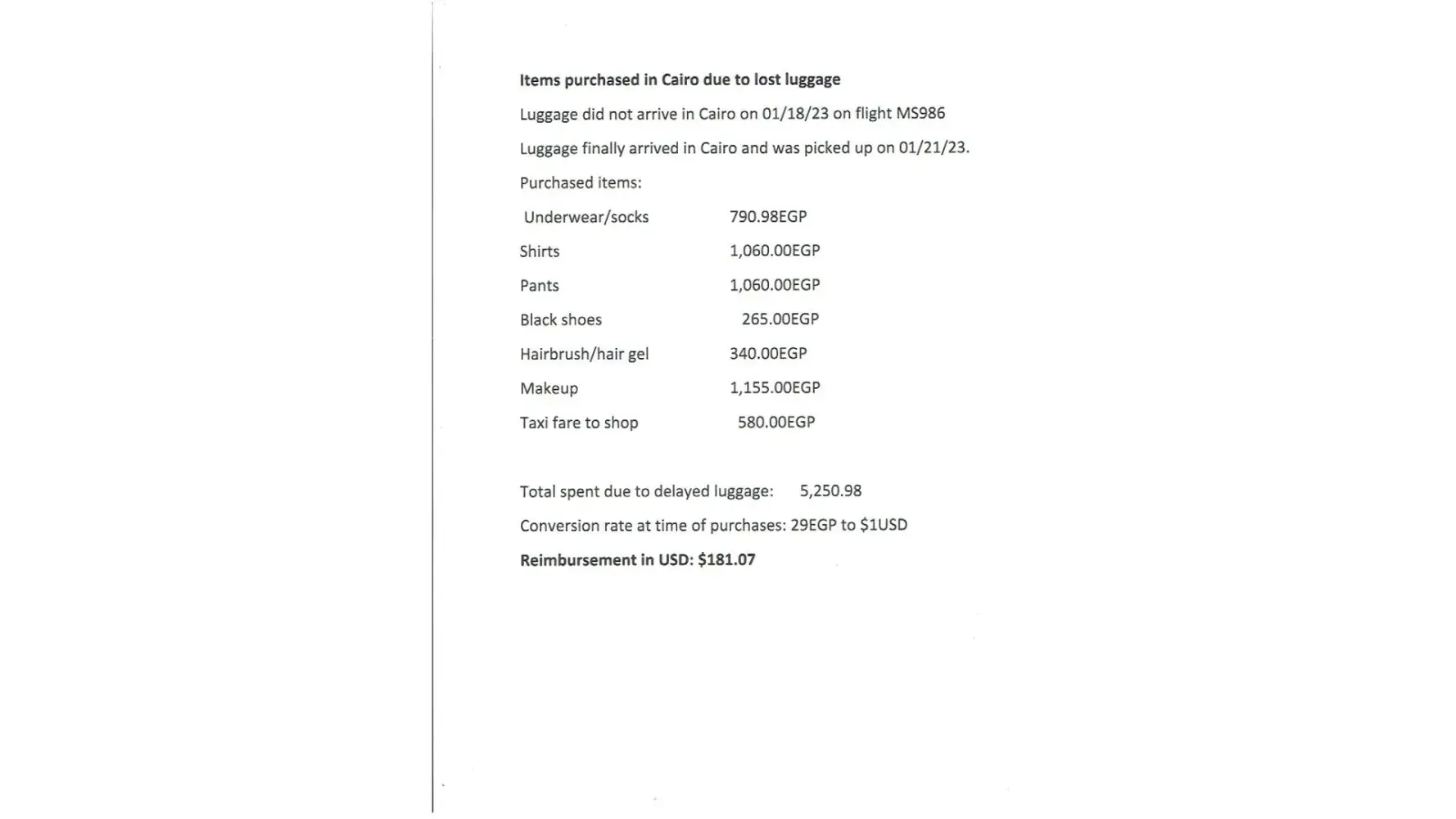 I am writing to formally lodge a claim for reimbursement following the failure to deliver my checked baggage during my recent travel from Beirut (BEY) to Beijing (PEK) via Cairo (CAI) on 23 March 2026 my luggage has been missing for five days.