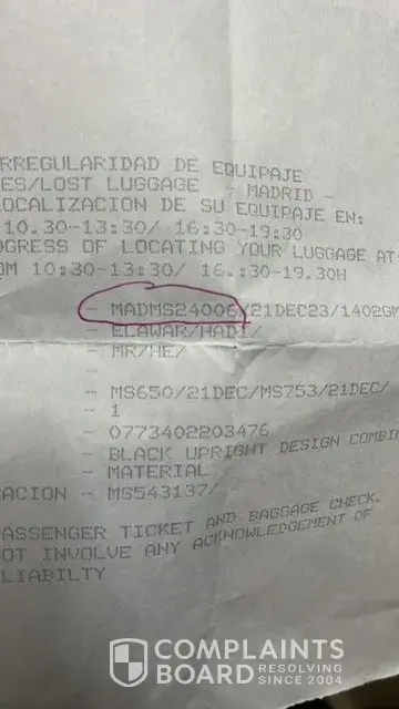 My luggage was checked in at Jeddah airport and I didn't receive it on London airport. The luggage tag number is: MS798099 and the flight number was: MS779.