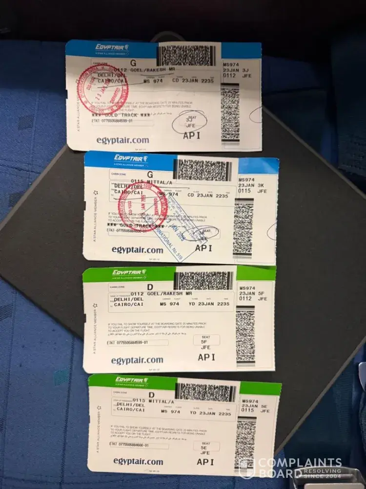 I am writing to raise a complaint regarding an involuntary downgrade experienced by our Directors on EgyptAir flight MS974 from New Delhi (DEL) to Cairo (CAI) on 23 January 2026. We had confirmed Business Class tickets, as clearly mentioned on the e-tickets and booking confirmation (Booking Reference: BIN-22134648). The passenger details are a...