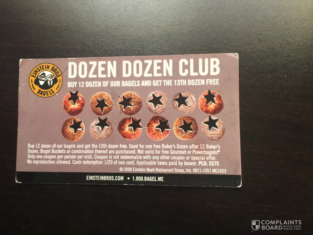 I have eaten at Einstein for years and I love the Senior discount. If you can accommodate me by providing me a free Einstein Gift card in compensation for the Dozen Dozen card. I would be most appreciative.