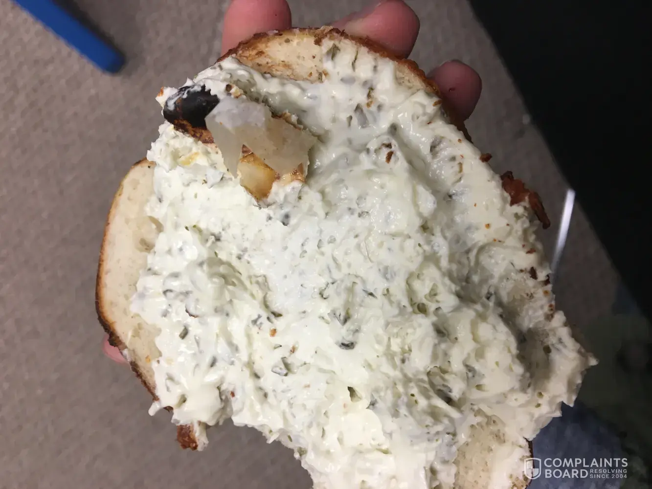 I ordered a jalepeno cheddar bagel with onion cream cheese at the Dubuque Iowa, Wacker Drive location. When I opened the bagel to eat it there was a big lump on the corner of the bagel, it was burnt and covered in cream cheese. I almost continued to eat it thinking it was a jalepeno or an imperfection in the bagel but when I looked closer it was wax paper. There was a wad of toasted wax paper that had been spread in with the cream cheese that I almost ate!