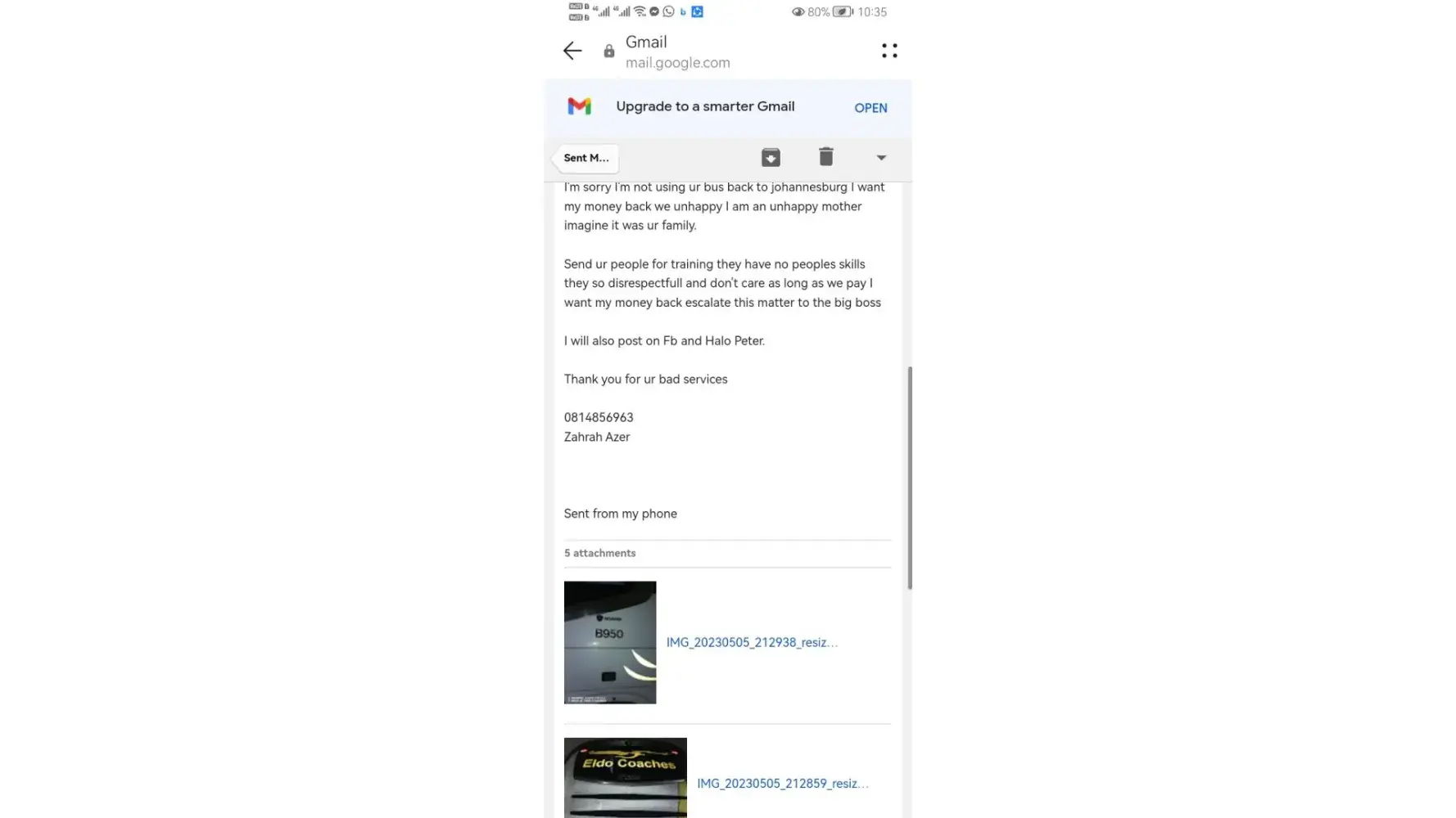 Hi, we had to wait 2and a half hours for this bus to come, my daughter is pregnant she had to stand in the cold all seats where taken inside refer to my attachments..ur staff at the window is rude ur staff directing us where to stand and wait is rude and speak in his language we didn't understand. There was no communication from ELDOS Staff, I want my money back I refuse to take this bus back Sunday the 14th I'm going to the police as everybody on ur platform and whatsapp lines is ignoring me 4660 I want it back. No charging point change ur adds on the site of u lie man. I'm an upset customer which had 3 kids with me. AL is want is my money. Read my emails below I have send to ur head office. [protected] Zahrah