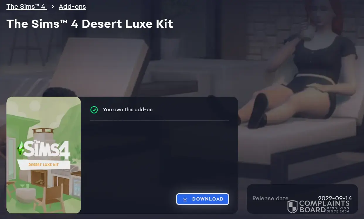 When the Desert Luxe Kit promotion began I "purchased" it for free but had an issue downloading it into my game. I tried to resolve it myself by logging in and out of the EA platform and even turned my laptop on and off again to see if that made any difference but it didn't.