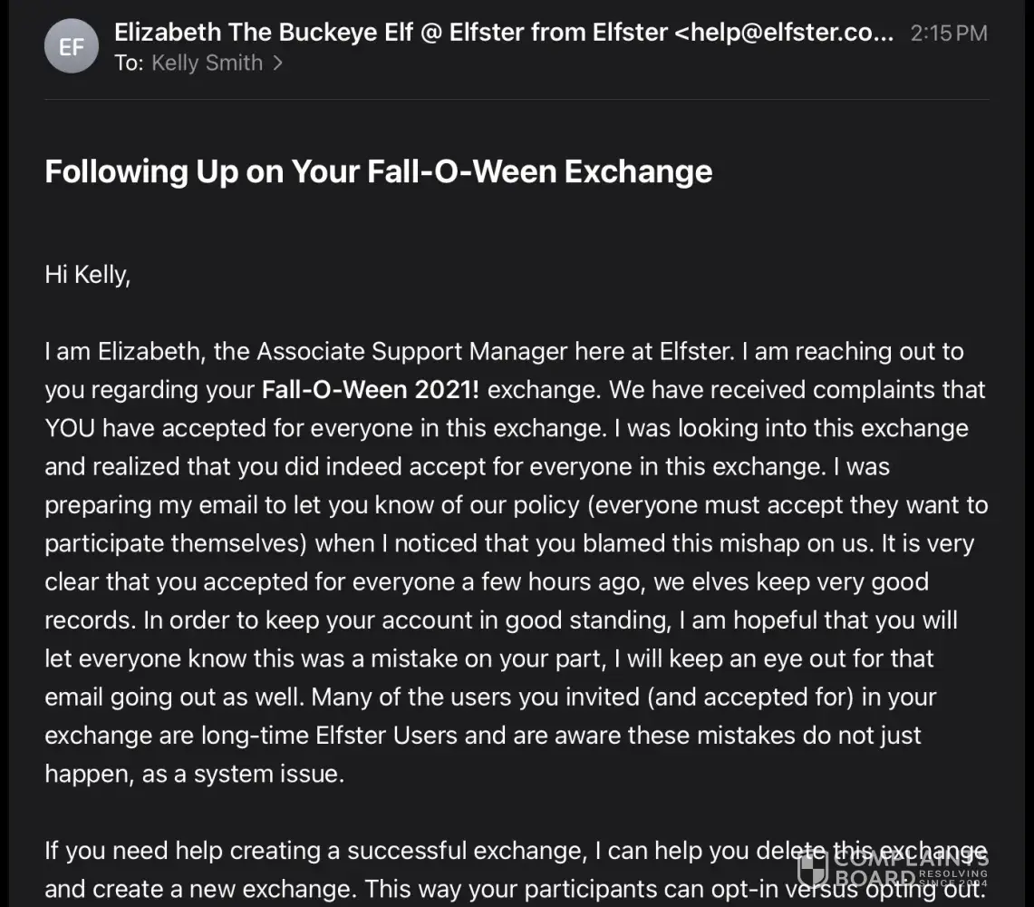 I was part of a gift exchange on Elfster and found that the past gift exchanges from previous years created confusion for me. Instead of tapping on a current gift exchange, I mistakenly tapped on a past gift exchange and sent a gift to the wrong person. I am annoyed that this occured because there was no warning given at any point in the process of what I was doing, and the system allowed me to go through the entire process without any prompts to verify that this was what I wanted to do. This has created a waste of money by buying a gift that I did not need to purchase and embarrasment as well. What's more, it is not as though I am computer illiterate. I file court documents online virtually every day in my work and the online system for the state judiciary where I practice law is more user friendly than this gift exchange. If I am annoyed enough to write this complaint, then I am pretty pissed.