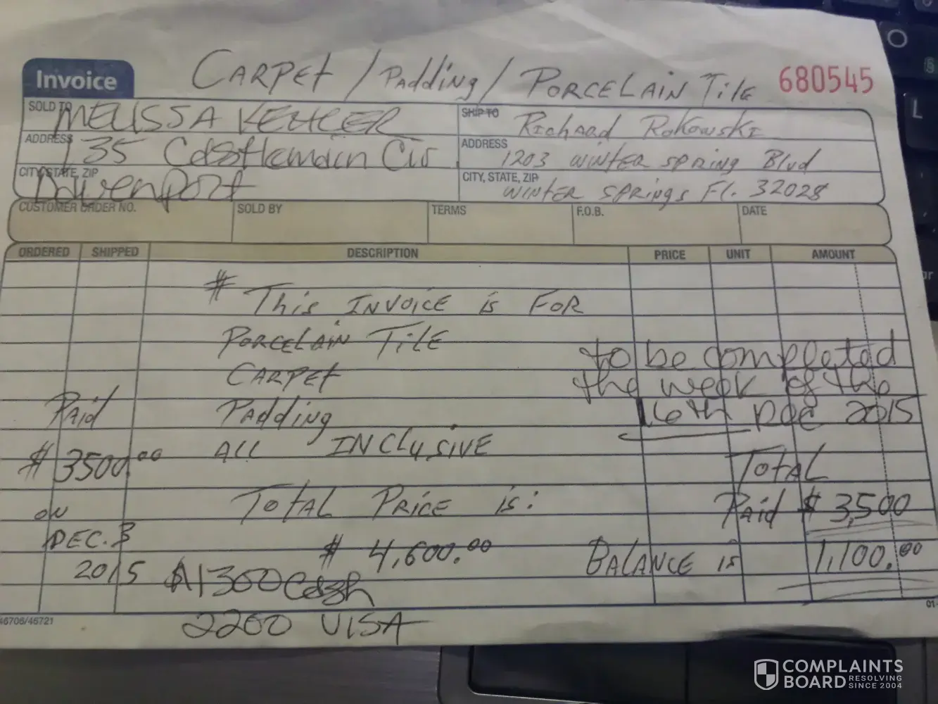 Hired Dec 3rd 2015 to provide and install carpet/padding/porcelain tile. invoice number 680545 Job to be completed by Dec. 16th 2015. Did not have the tile/carpet/padding thoughout that whole time, gave excuses why the product wasnt available, couldnt find anyone to help him with the install after he told me he had a team of 4 guys. Job guaranteed to be done within the timeline requested. I had chosen the tile colour/carpet colour. I started to find someone else to do the job and he got very nervous and finally on the evening of the 18thDec 2015 he installed carpet. Not of which I ordered. I paid him $3500 in which I did not get any of the tile job done and not the carpet I ordered. He went to an tile outlet store that I had already chosen the tile i wanted and had spoken to the owners there. Richard said the tile was there and it was a go. Then he told me that place didnt have enough tile and I could go with him and his tile and it was cheaper than at the outlet. After hiring another crew while Richard was on this job I found out that there was plenty of the tile I wanted and had to order it and have my new crew go and pick it up and install it. I would like the a full refund of the $3500 paid. I spoke to other flooring guys in the Orlando area and Richard is known to them and told me of work they had to fix on his behalf and not having a team of guys to help and taking peoples money and not doing the job promised. also that nobody wants to work with Richard because of his poor attitude and work ethic and dishonesty. I have many emails but cant seem to save them into any format that I can upload.