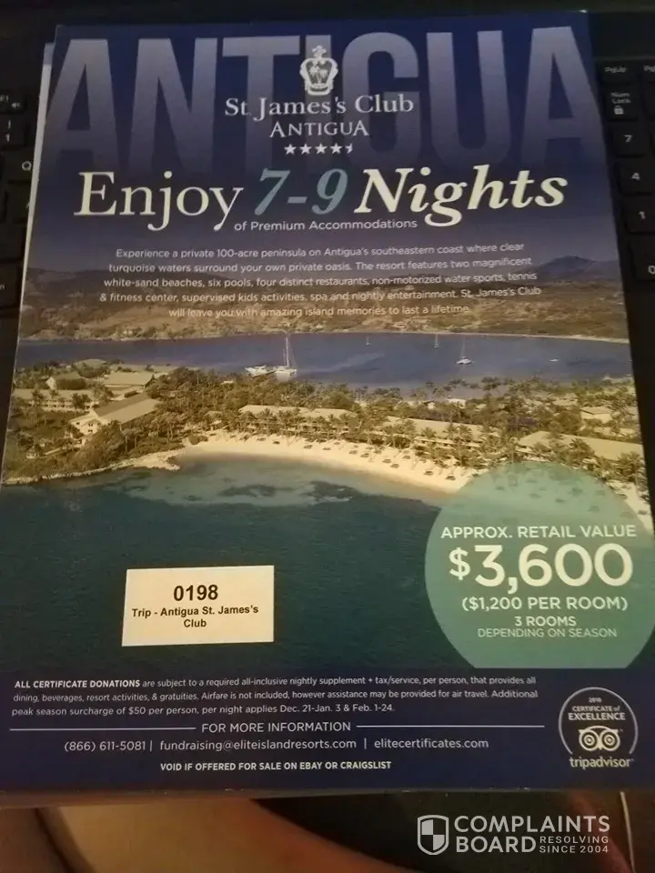What am I missing? I read the complaints above and not one of them mentions that their not-for-profit organization benefited from the auctioning of the Elite Isand package.