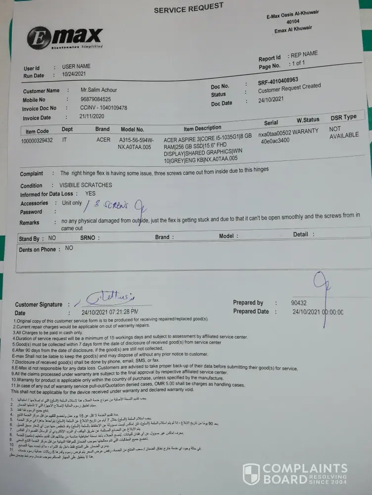Customer service is reluctant at repairing my acer laptop purchased from Oasis Mall AlKhuwir branch