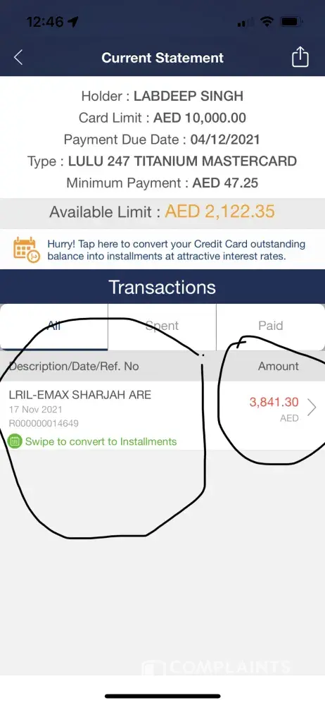 I had purchased iphone13 pro from emax wahda branch, i requested the cashier that i want to apply for installment plan and i will be paying with samsung pay, then he called someone to get guidance and then asked me to tap the samsung pay but when i had tapped my card, machine deducted the complete amount and cashier was shocked that there was no 12 installments plan appearing on tapping machine after the payment was processed but maybe to calm me down he asked me to call the bank and then they will do it but now when i am trying to apply for installment plan, bank is charging me 410.22 AED to convert into installment and i cant pay the this huge amount all at once. Please look into this and let me know solution