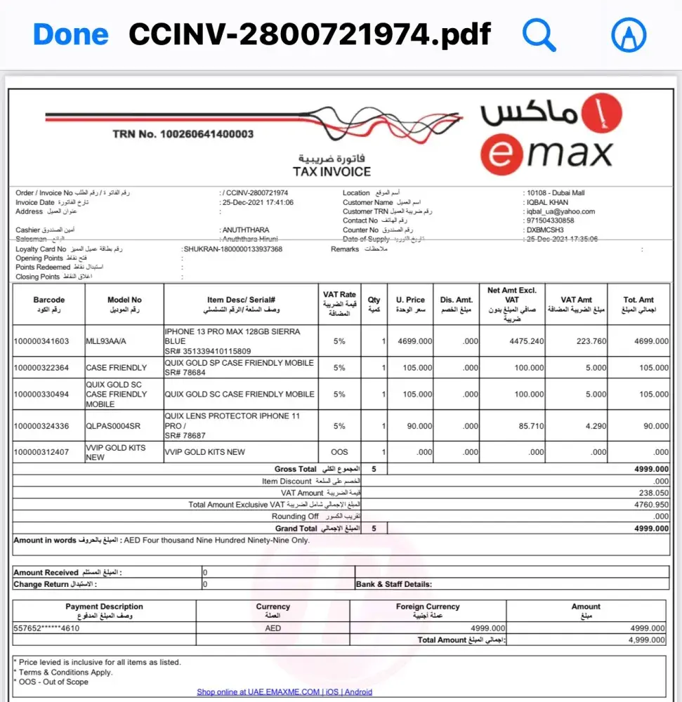 Bought an Iphone 13 pro max 128 Gb seirra blue in Dubai Mall Emax store on 25.12.2021. The price was 4699 AED and I asked the salesman that whether there are any bundle gift included with the above mentioned price. He said that there are no extra gifts with the phone, but the store will coat my Iphone with a thin plastic cover, barely visible and that will be for free. I agreed and paid the amount with me debit card. This guy also said that he will send the invoice through email. It was late in the night and when I reached home, i saw that they have charged me 300AED more for some QUIX GOLD SP CASE, Quix GOLD SC CASE FRIENDLY MOBILE AND QUIX LENS PROTECTOR) phone CASE(iphone 11).