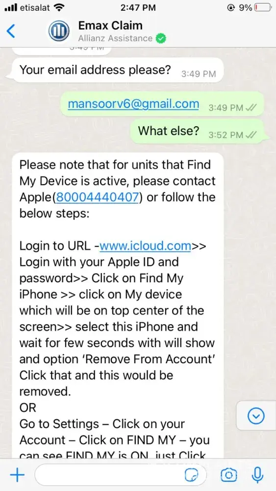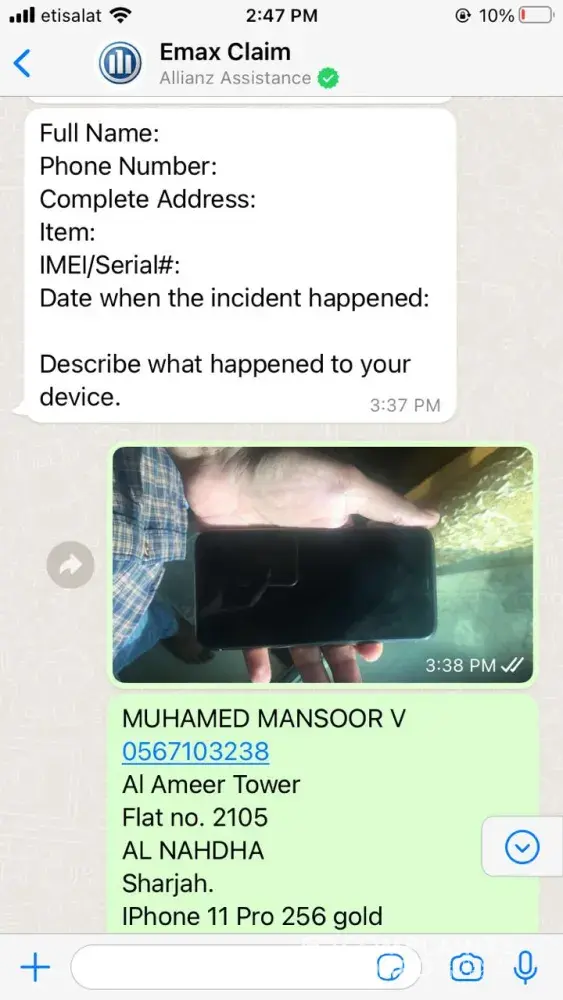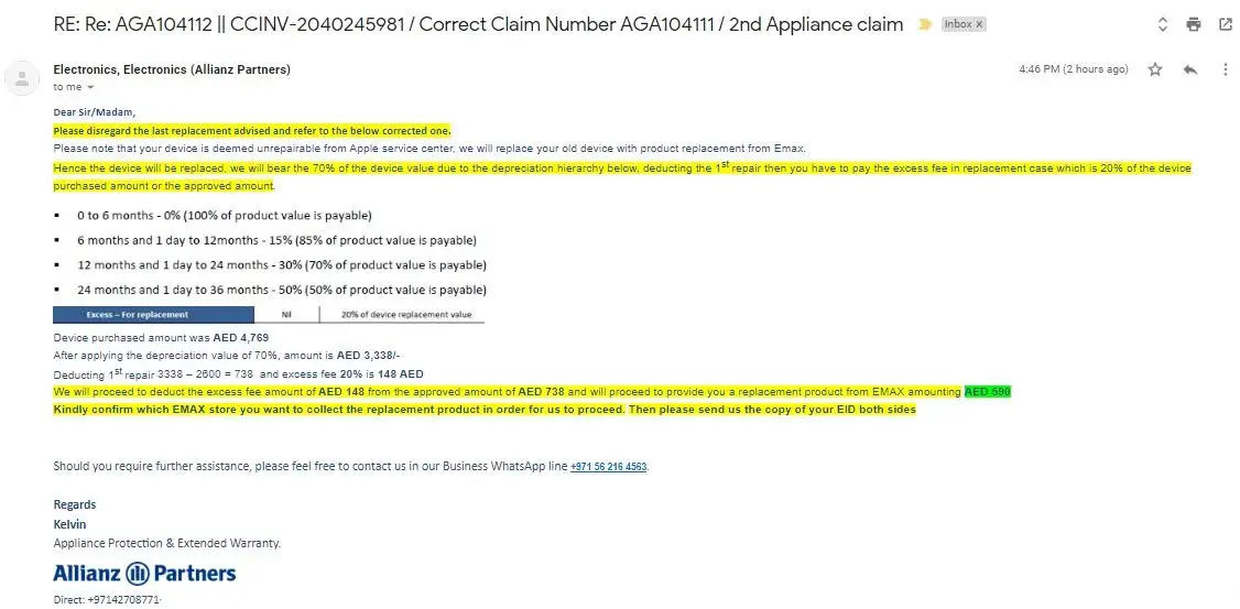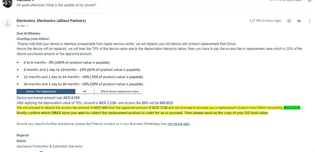 I have taken 2yrs accidental damage protection policy for my iphone 11 pro and I have 2 claims throughout the policy period. When I gone for my 2nd claim as per their given information (mr rogan) I was asked only to pay aed 300 service charge and agreeing to that they have arranged for the phone collection and collected it on 25 dec 2021 and after 4 days there was no information regarding my phone so I messaged them and enquired about my phone then now they are saying (mr kelvin and lavinia) they will deduct 2600 which now they are saying for my first claim from the second claim and my policy limit is 786 (which has no where mentioned in my policy also not mentioned or given any bill after my first claim and repair) remaining amount I have to pay which was completely unethical from your side and each and every time they are sending different emails claiming different payments and not even giving better clarity regarding the issue if I am sending mail to rogan kelvin is replying from other mail and that too completely different things and other reply is coming from lavinia etc al happening in same day and saying that was technical error that's y they given misinformation is that my problem? I have all the documents with me which I will attach here for your reference. As per their given details only I have send my phone for repair and they wasted my 4 days and now when I asked they are saying all these are purely cheating from your side. So I want this issue to be sorted out soon as I don't have time to waste and I can't wait anymore please give back my phone after repair or replacement for aed 300 only