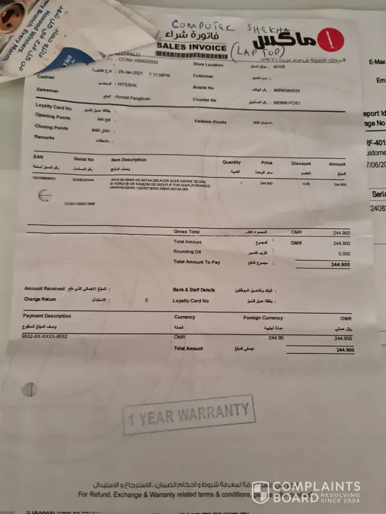 Please support to me on this matter . I bought Acer laptop on 29th January 2021 from Emax shop in Oman, in April the screen was black and not working after they checked they said they will either to return back my money or to replace with another laptop i had to wait 40 days to get confirmation after that they said they will repair the screen only. So they repair it and i collected the laptop in 23-May-2021, after that i found out the microphone is not working i took it back to emax service canter again on 7-June-2021 and till now no feedback on it every day they say next week.