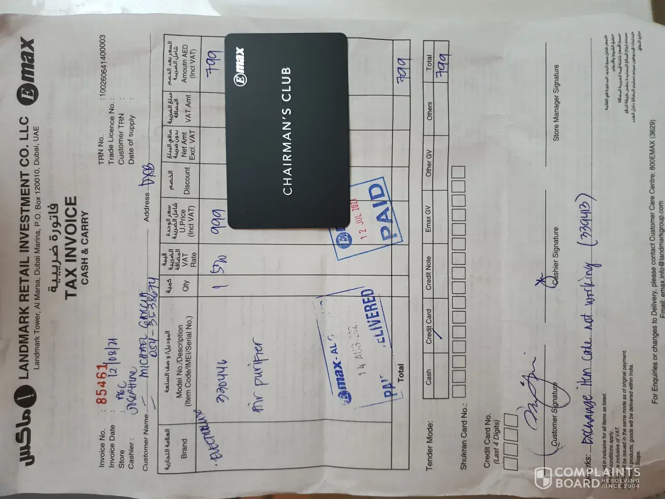 Emax / Max Electronics I am complaining about the delivery of my product.