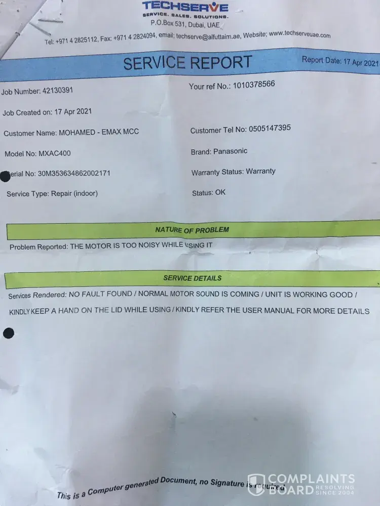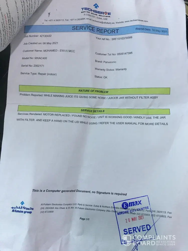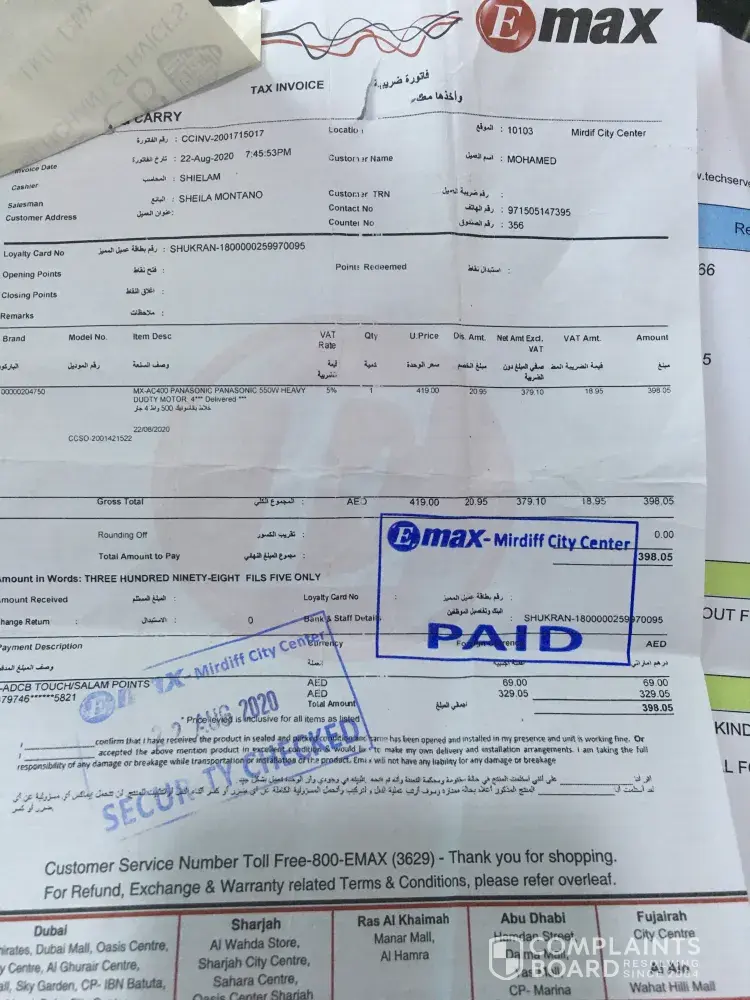 I would like explain about an incident regarding my panasonic juicer problem. I am regular customer of Emax for long time that you can confirm if you check with my mobile no. I am not a high salaried person to bear this kind of incident. I bought a panasonic juicer on 22.08.20 and started giving niose while using big jar. We thought it is normal and later on increased, so we given to midiff showroom on March and returned on April with a report as no defects. But when we use the same problem found. Again we gave to mirdiff showroom Dubai on May 2020. They returned after service as earlier. Unfortunately my wifes father sick and died on May and family went to india and came back on august 2020 due to flight issue. Now on took this again to mirdiff centre showroom service office on 16.09.2021 and spoke with Manager on duty and they said as the warranty expired cannot accept it and now they say accessories will not cover. I nvee told them to replace it just to repair. I would like to bring this matter to you because I never expected such a behaviour from such reputed show room. The sales guy told me to put some oil and try it but this is not the right way to deal with customers because this issue started in the beginning and solved. We comes to your showroom as we have trust with you.