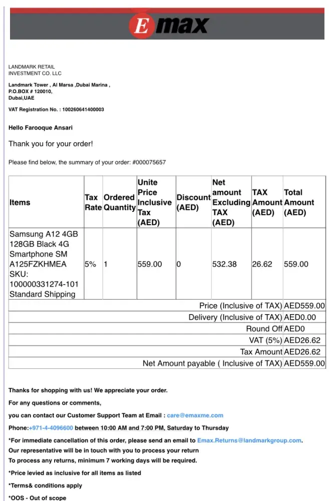 I ordered an Samsung mobile from Emax in Dubai on 12september 2021 but today is 20 September and still didn't get my product even Emax didn't give any updates regarding my online product delivery