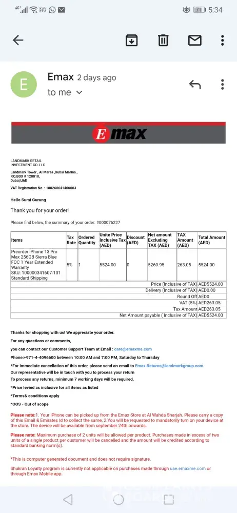I had purchased(pre-order)iPhone 13 Promax online from the Emax website on 22/09/21, and the same day I have received an email that mentioned-