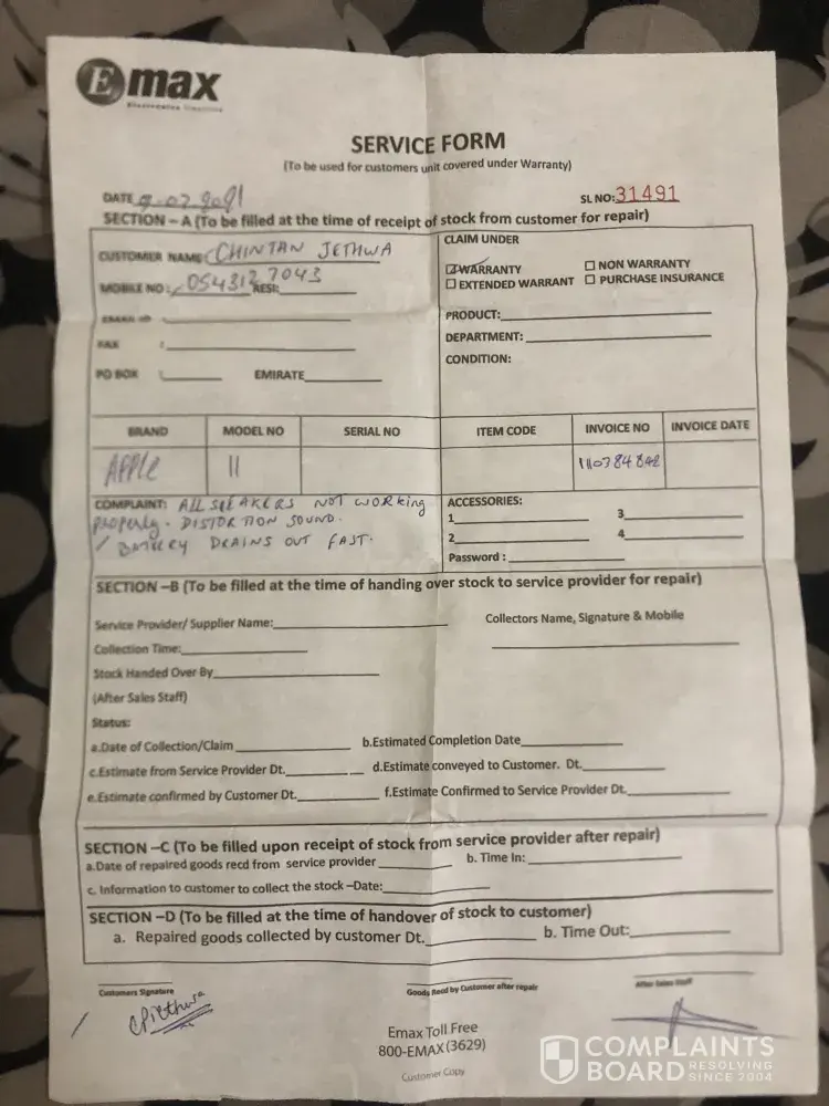 I gave my iPhone 11 Pro for servicing on 9/03/2021 at 7:30pm at emax store at al Ghurair service Center. I have been following up with the customer service team where they gave me wrong information everyday. Than I started following up with the store and all managers in the store gave me incorrect information. Today being 25/03/2021 and now they are asking me to wait for 2 weeks more which is not acceptable because of some staff mistakes. Attached are the documents. A call from you will be appreciated