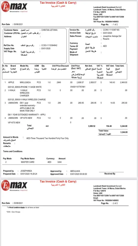 please be informed that i purchased a mobile set on 28.may, 2021 from emax store Alwahda store sharjah.