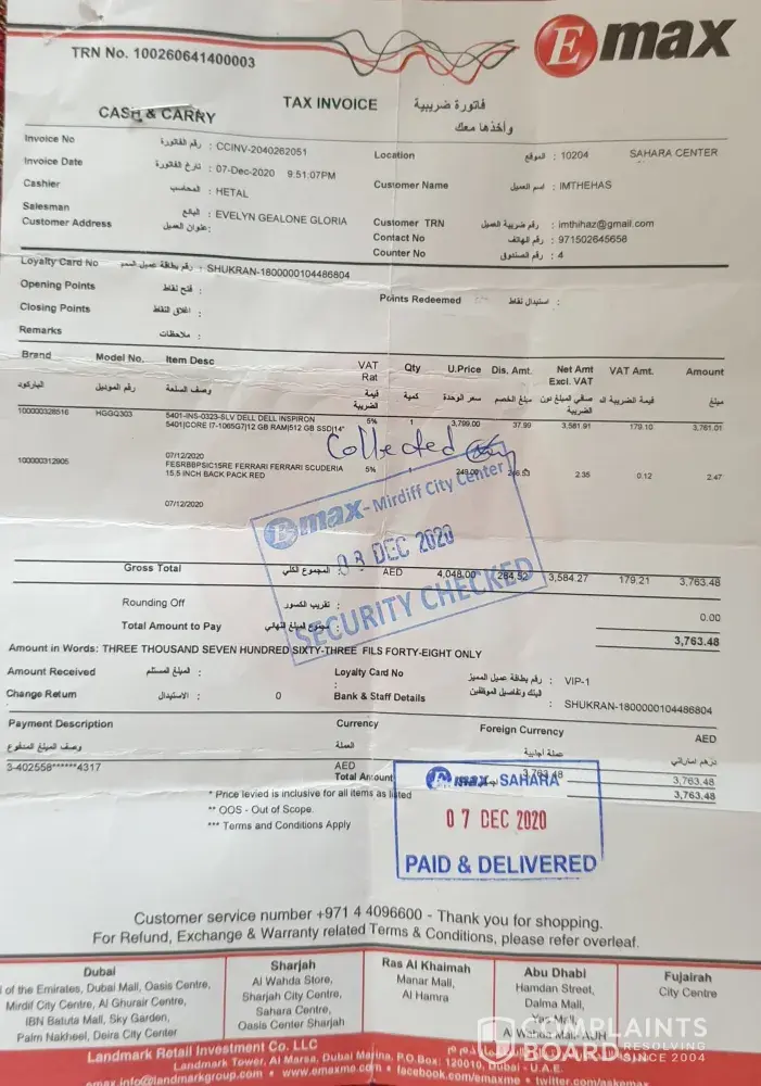 I have purchased a Lenovo Laptop from Emax Dubai Mall 9 months back. After 6 months the laptop is not switching on and we had given to Emax for servicing. After 2 weeks they return the laptop confirming that the issue is solved and in the service report it shows that the problem with motherboard. While leaving the Emax Dubai mall showroom they show me the power LED is glowing and I collect the laptop.
