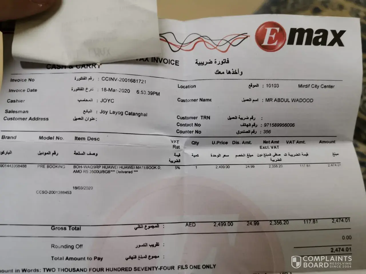 EMAX Invoice number: CCINV [protected] dated 25 July 2020, Al Wahda, Sharjah