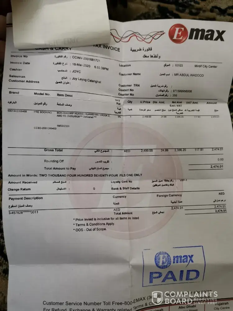 On 09th OCT 2020, I made a payment of 4899/- aed towards the subjected laptop which I collected from Mall of the Emirates branch because Deira City Centre branch doesn't have the product. Mr Sanu Magar was very helpful from start to end with the purchase. I hardly used the laptop because since the day I purchased it was working at all. Initially it used to stuck while using, secondly the same happens but with huge noise and finally it was not able to turn on at all. I left uae and went to calicut, India. When I contacted DELL customer care, they informed they will not assist even though i had international warranty on the laptop ie BQW8HX2. I had to fly back to Dubai, UAE in order to have the issue resolved by bearing flight ticket and visa expenses. On 13th NOV 2020 I returned the laptop to Mr Omar at Deira City Centre EMAX. He told will get back to me, which didn't happen. On 18th NOV 2020 I visited the same place and met Mr Sanu who assured me will draft a detailed mail to the concerned department and help me to get a credit note because the laptop is dead on arrival (DOA). He also promised to call or have the IT team call on the same day before 1300 PM which did not happen. On 19th NOV 2020 Omar called and informed they are working on it and will get back to me on Sunday ie today which didn't happen. I called him at 1518PM and he assured that will call back before 1800PM which also didn't happen. I sent him an sms requesting the status and he called back at 2133PM. He informed me the technicians from DELL confirmed that there is an issue with the HDD which they will replace and get to me within two working days. I told him clearly stating 4899/- aed is a huge amount for me. I had to work really hard, earn, save then purchase this laptop. At no cost I am willing to get a repaired or refurbished laptop. As promised by Mr Sanu I need a credit note or a brand-new DELL LAPTOP - 7590-VOS-E1393-GRY with a new unique serial number. Mr Omar said will WhatsApp me an email address to register a complaint which he did not do as of now ie 2326PM even though I sent him a reminder sms to do so.