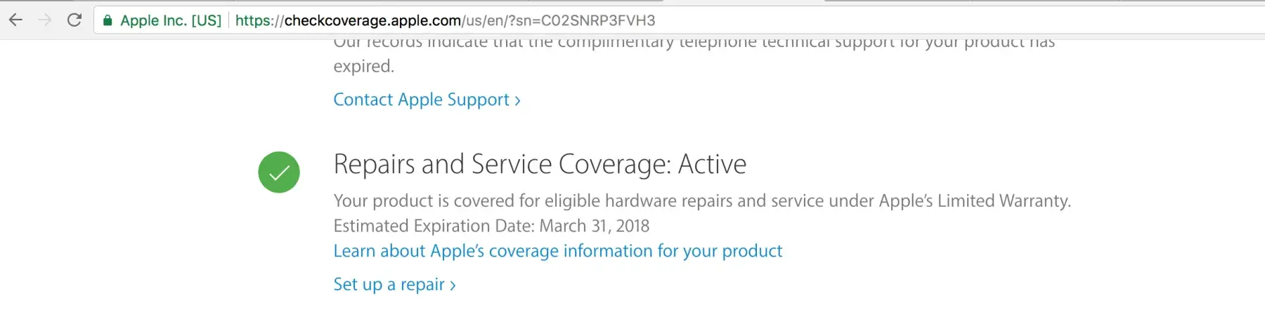 I purchased a MacBook PRO 13-inch Retina core i5 from Emax store during GITEX on 1st April'2017. I had opted for 2 years extended apple care warranty during the purchase. Recently, when I checked Service and Support coverage of my MacBook on Apple website, I was really shocked to know that my macbook's service coverage is only till 31st March'2018(screenshot attached).