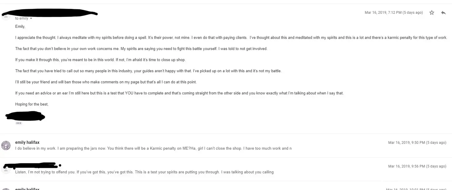 This complaint is laughable. As part of Emily's community for several months, I have watched and studied this woman. If you want to question her ethics and credibility- go watch her YouTube channel. Emily has done nothing but openly communicate her workload status/status of client schedule. She has communicated her standards of accepting clients and her business policies. She has many many multiple confirmations via comments on her channels comment section and within live chat to the fruitful outcome of her workings. Emily has ACTIVELY on MULTIPLE occasions educated her viewers on what to look for from dishonest workers within her industry and shared her own story of being a victim of such dishonest workers. To attack this woman's ethics, morals and business practices is horrendous. I am currently a client of Emily's and can confirm that she and her staff have reflected nothing but the highest business practices. And as far as her 'abilities' in the realm of spiritual work- this woman IS THE REAL DEAL. What some fail to realize is that the best spiritual workers can perform the services, but if the universe does not see fit to manifest anything- it won't. Perhaps those individuals need to look at their own actions and take that into consideration. Emily Halifax is 100% an honest, ethical and extremely talented root worker and business woman. I stand behind her.