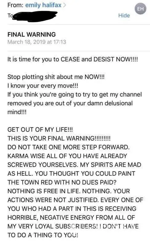 The only reason these people posting these lies are so bitter is because a group of people, 4 of them (subscribers on her channel) decided to take a trip from out of town into Emily’s town to go see her, ( not creepy at all right?). Anyway, they got upset because Emily was too busy to make time for them and decided to get her back by spreading all this inaccurate information which they have twisted into their own fake story. Now they are obsessive and determined to mess with Emily’s work. This by the way is called defamation of character and it is ILEGAL!