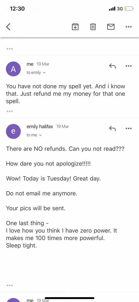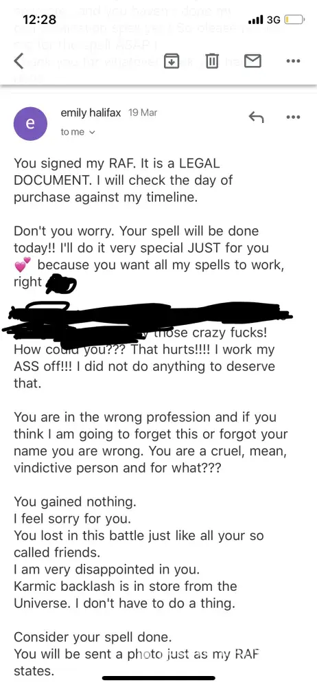 Emily Halifax is a very vile negative woman and she abuses people and you trust her to do your damn spells? They say when you’re doing work you must be positive, cleaned of negativity and in a strong mind frame to raise your vibrations but this woman has very low vibrations and negative energies around her. I’m done here let her sheeps find out later when she scams them out of their savings lol.