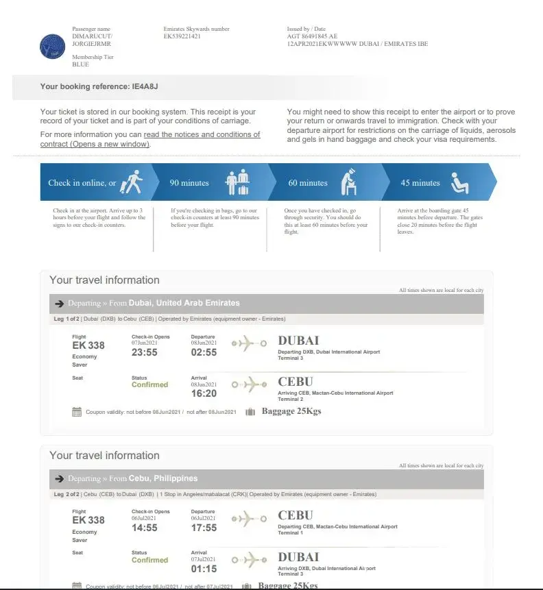 Emirates Booking Reference: KMXTQB
