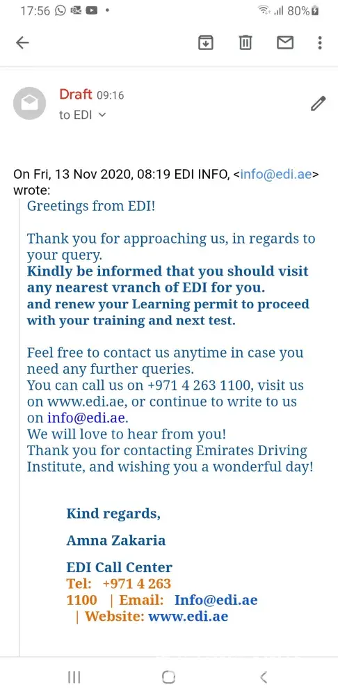Just a few suggestion to EDI . I spent with this school 11K and took 80 hours of driving. 11K it's a double price of the regular course. When someone paining such amount which equal to my two months salary it's very unfair and look like the school wants only your money. I stick on final road test with RTA, the attitude of RTA team not so ideal as well, I didnt like their comments due to test as it's disturbing and creating bad environment inside the car which effects negatively on the focus of the student. EDI has an unlimited course where student can pay 8, 500 AED, why you dont give any good discount to the students who spent already 11k AED with your school. No one ideal, you can't get a professional driver with few hours. You just demotivate and stressed students too much. I lost my confidence and any desire to go and continue with my classes for getting driving license.