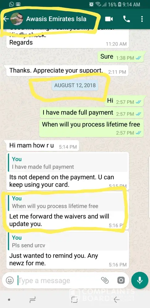 In Aug 2018, I followed up with him like you can see from my chat, and he said he is processing waivers. And then he completely vanished. In Feb I realized that he did not process life time free. So I raised a complaint EI-1-[protected] in Feb and that is when my trauma weith Emirates Islamic started. Weekly calls and escalations by me to emirates and multiple mails sent, lot of assurance from Emirates that they will deal with this fairly and then one fine day I see the complaint is closed without information to me.