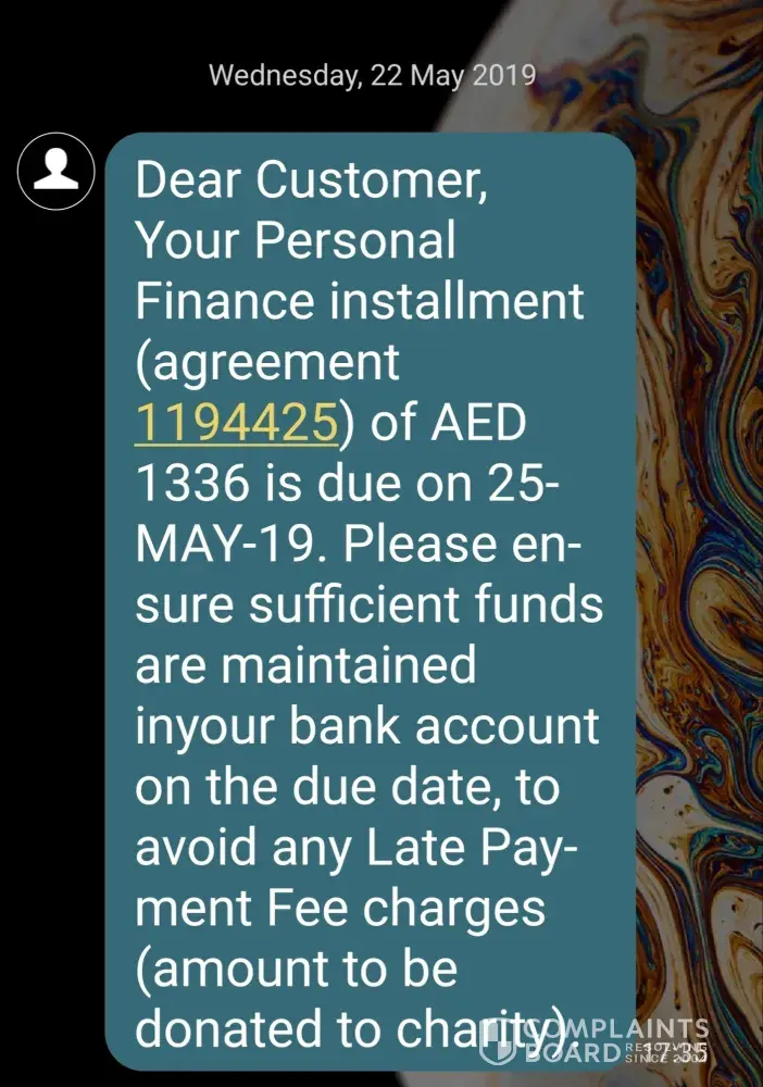 I got a message from Eibank on 22 may 2019 that your personal finance installment date ia 25 of may if there is insufficient fund and balance in your account will charged as late payment fee and will donate to charity ast 5 years my salary deposited on between 26 to 29 of every month, how can u charged, if there is any such mind of charge i will take legal action and will take help from social media how emirates Islamic is donating to charity