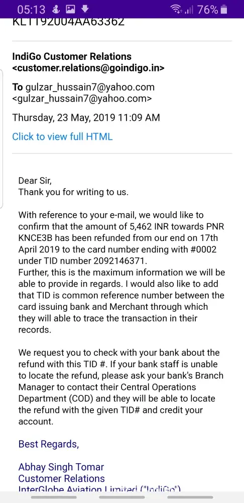 I HAVE CANCELLED ONE AIR TICKET LAST MONTH REFUND IS NOT CREDITED TILL DATE,