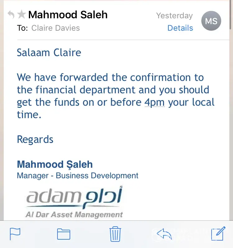 They forwarded it to me. Weren't very happy and month later I lost my job! Now I have been out of a job for 6 months after due to the mental and emotional stress they caused. Thank God I have a job now and paying the money back. I am in the process to raise attention to Interpol and the UAE government to consider regulations over their Debt collecting companies. This has been an absolute joke!