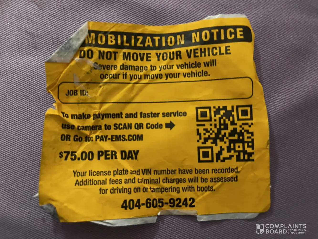 Following the meeting and returning to my car, I found 2 boots on my car with an orange sticker on my window - an "IMMOBILIZATION NOTICE". It said do not attempt to move your car, but call 404.671.2490 and that $75 would be required to remove the boots. There was NO COMPANY NAME on the sticker, so I had no idea who I was calling.