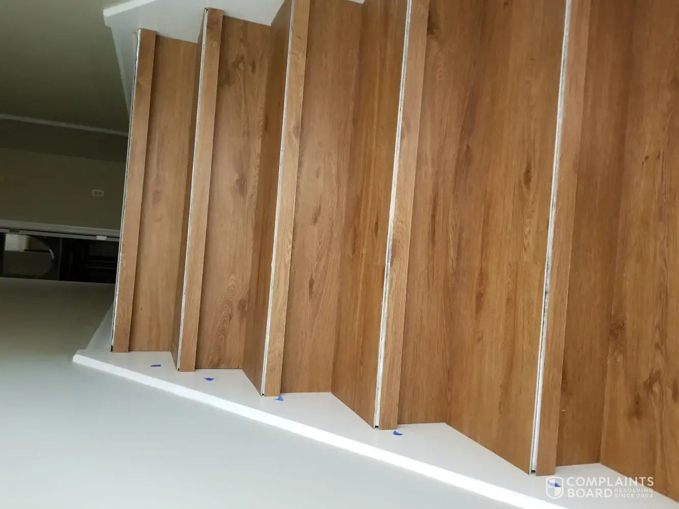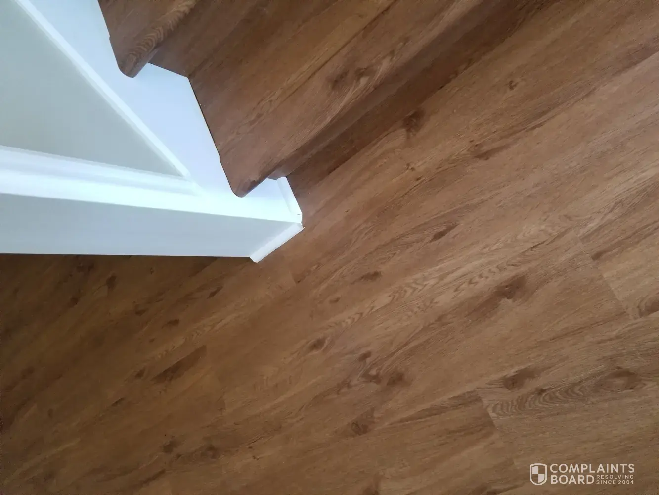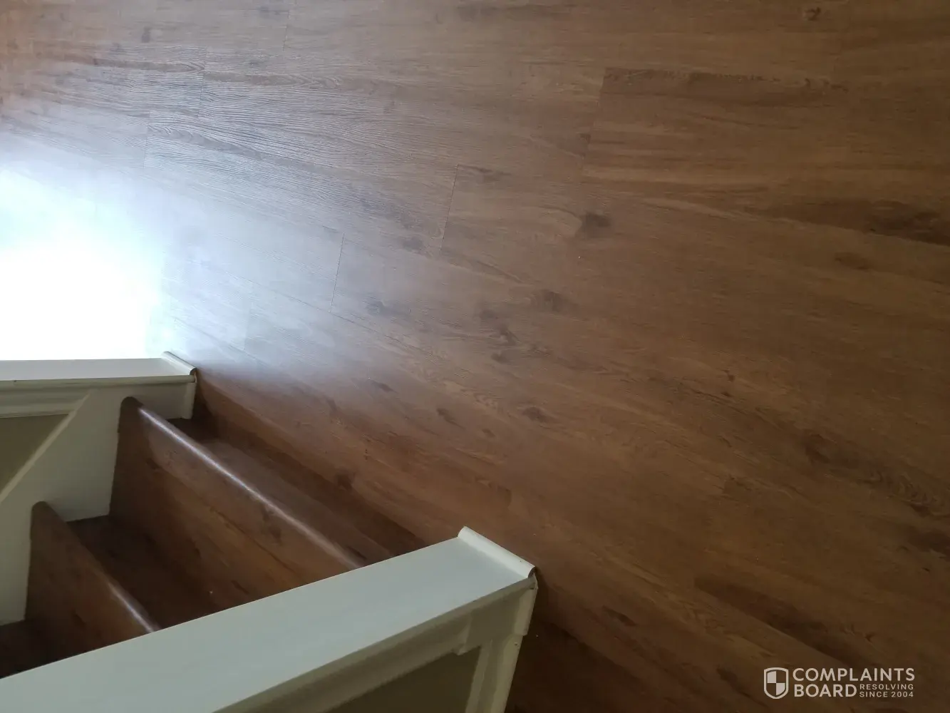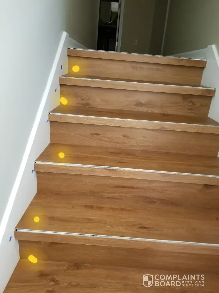 Desired outcome: We would like our floor completely installed, our updated contract, all corners corrected and the stain at the bottom of our stairs fix. We think the installers waste glue or something that will not come up.