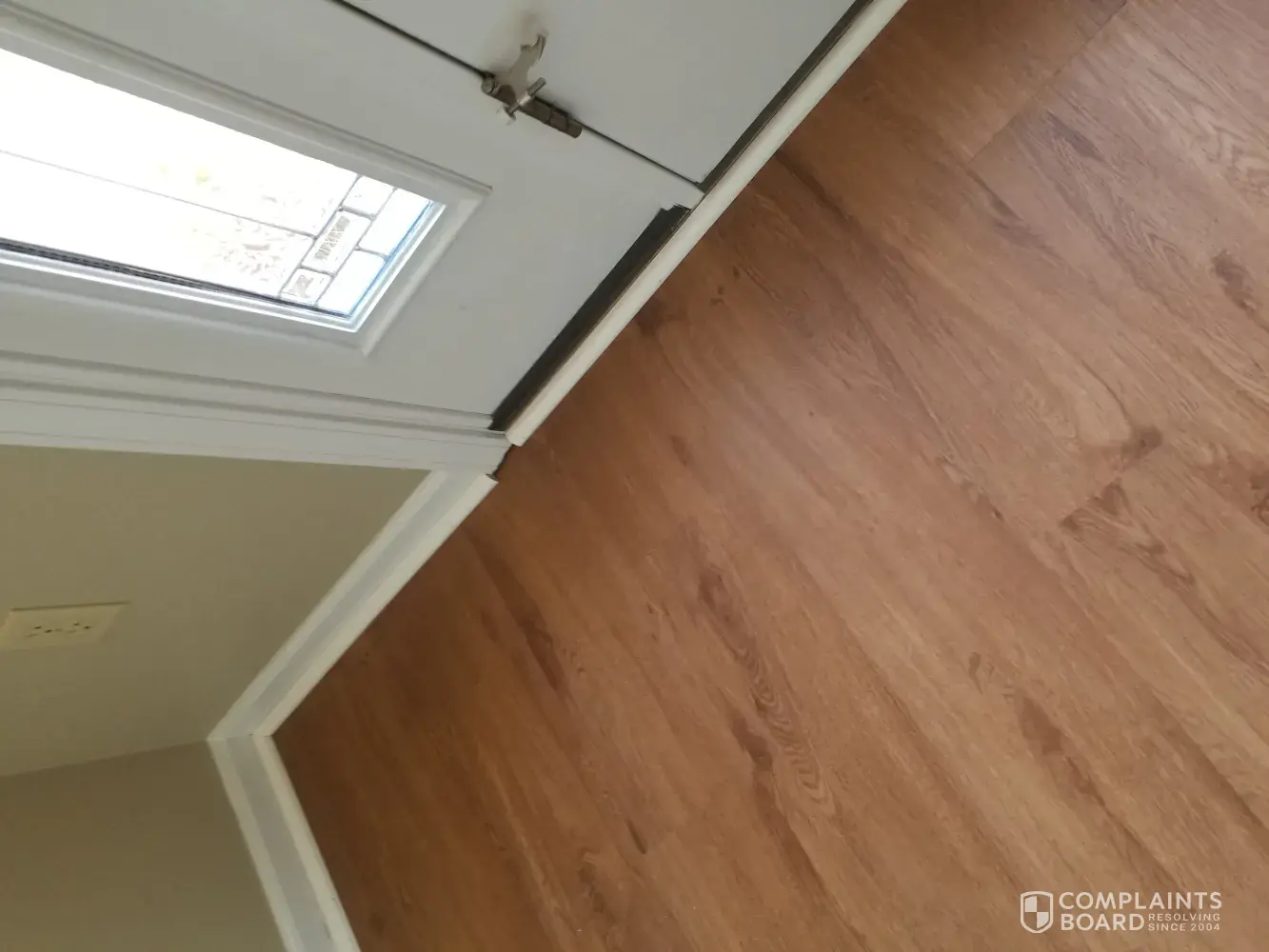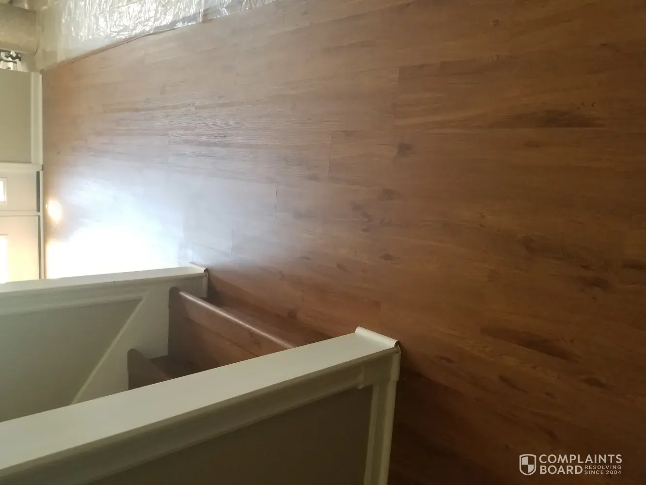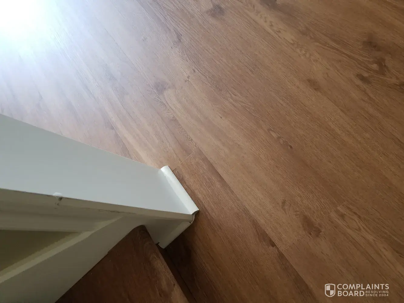Desired outcome: We would like our floor completely installed, our updated contract, all corners corrected and the stain at the bottom of our stairs fix. We think the installers waste glue or something that will not come up.