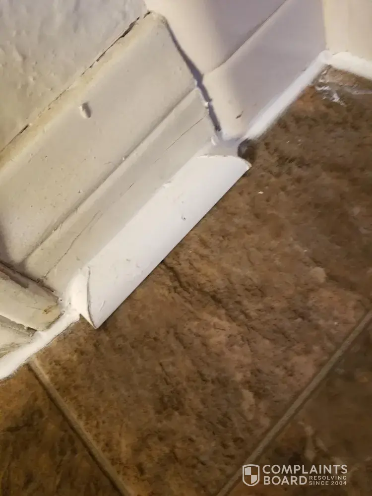 While my vinyl floor was being installed I did not like the white quarter round and white caulking that was all over the vinyl floor and asked him why there was so much caulking. He said that's what they told him to use. I wanted him to stop but he said that he had to install it and that I could complain later. I was told by the salesman that only a bead of caulking would be used near the tub areas. I installed vinyl in 2 bathrooms. There was white caulking everywhere. I will attached photos. After the installer left I called Empire Today and complained. I also requested that they do not send the original installer again. If he thought he did a good job then what would he do again. I have had crews out 4 times to resolve the issue of unprofessional installation, damage to wall from the toilet being returned to original position, glue on the wall and doors, tiles that were banged and fell off and damage to baseboards during installation. This is damage that cannot be repaired by unprofessional installation. Not only was there damage to the baseboards on the original installation it is even more damaged after it was fixed by the original contractor. This is the same person I requested not to return. I believe that the company Empire Today hires must be responsible to fix the damage. This must be their rule or part of the contract. I am requesting a large reduction in my original contract, which is 15 pages long. The offer in reduction from Empire Today will not pay for the estimates I have received to repair the baseboards and wall. I am posting the before and after photos. Customer relations has been very helpful in trying to resolve the problem but you cannot fix the damage without replacing the baseboards, which Empire Today is not willing to do. I
