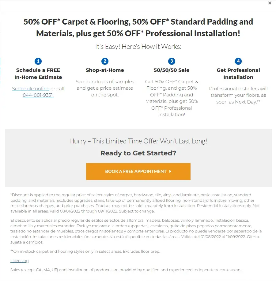 FF-I notice another sale before the install has taken place so I call up to take advantage of the sale on my order and I get the same run around about how they cannot give me the sale price because it's not available in my state because of some state law I cannot find and they cannot tell me what it is... I've attached a photo, the sale is for one carpet or one LVP according to the sales guy but the ad clearly implies a broad choice, "*Discount is applied to the regular price of select styles of carpet, hardwood, tile, vinyl, and laminate, basic installation, standard padding, and materials."