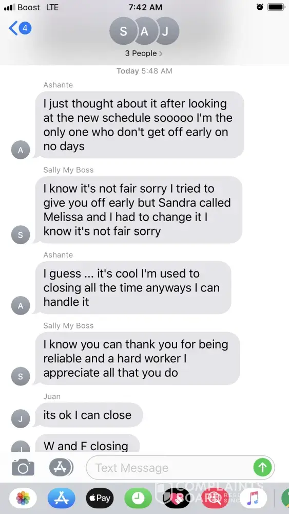 Hi ever time I say anything different or say hey it supposed to be 2 people working on friday and saturday its a problem I talk to my dm which made her change it but now she wrote message that i'm tagged in taking about me I thought since the dm said change it right... She even make racist comments to me and want me to laugh about it. But since I made a...