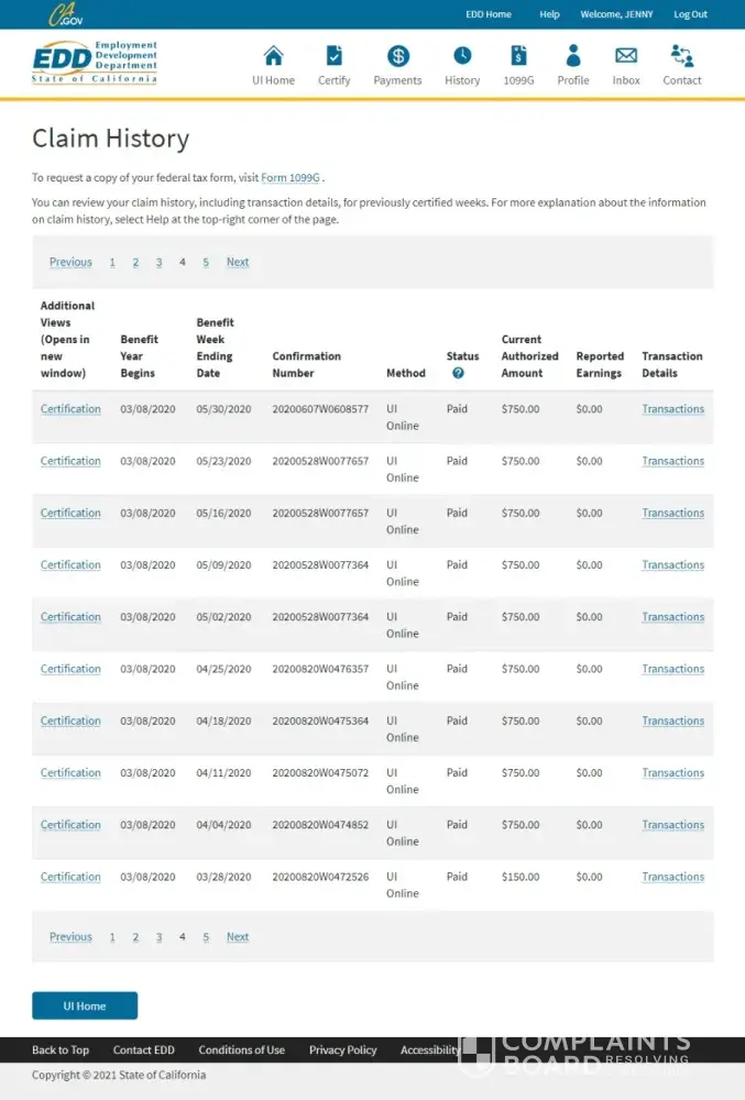04/27/2021 to present, Claimant has requested payments though online UI and has not received an appropriate response. EDD simply writes "EDD has received your question".